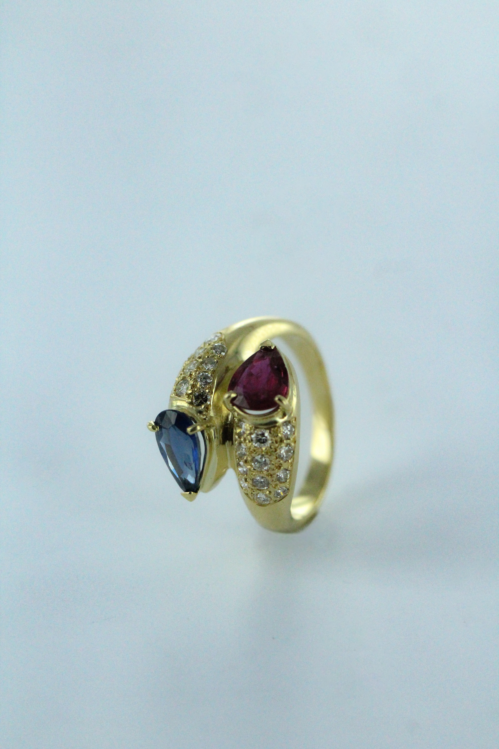 Bague toi et moi saphirs et rubis + diamants d’environ 5.76 grs